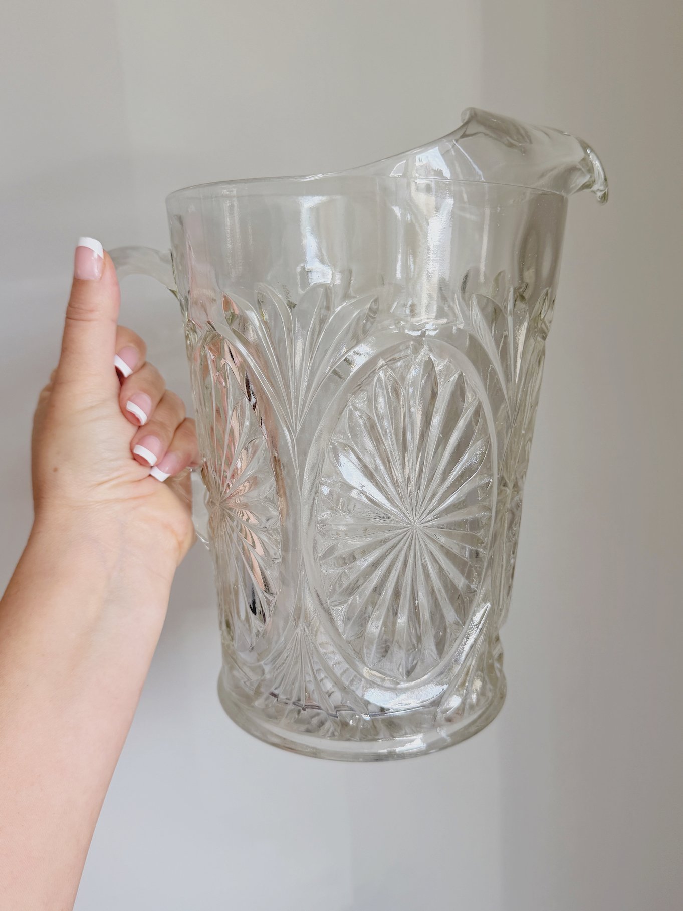 A 1970s Anchor Hocking Starburst Medallion glass pitcher with beautiful pressed detail and a satisfying weight to it. In pristine condition, it’s perfect for fresh flowers, mimosas, or simply catching the light on your table.