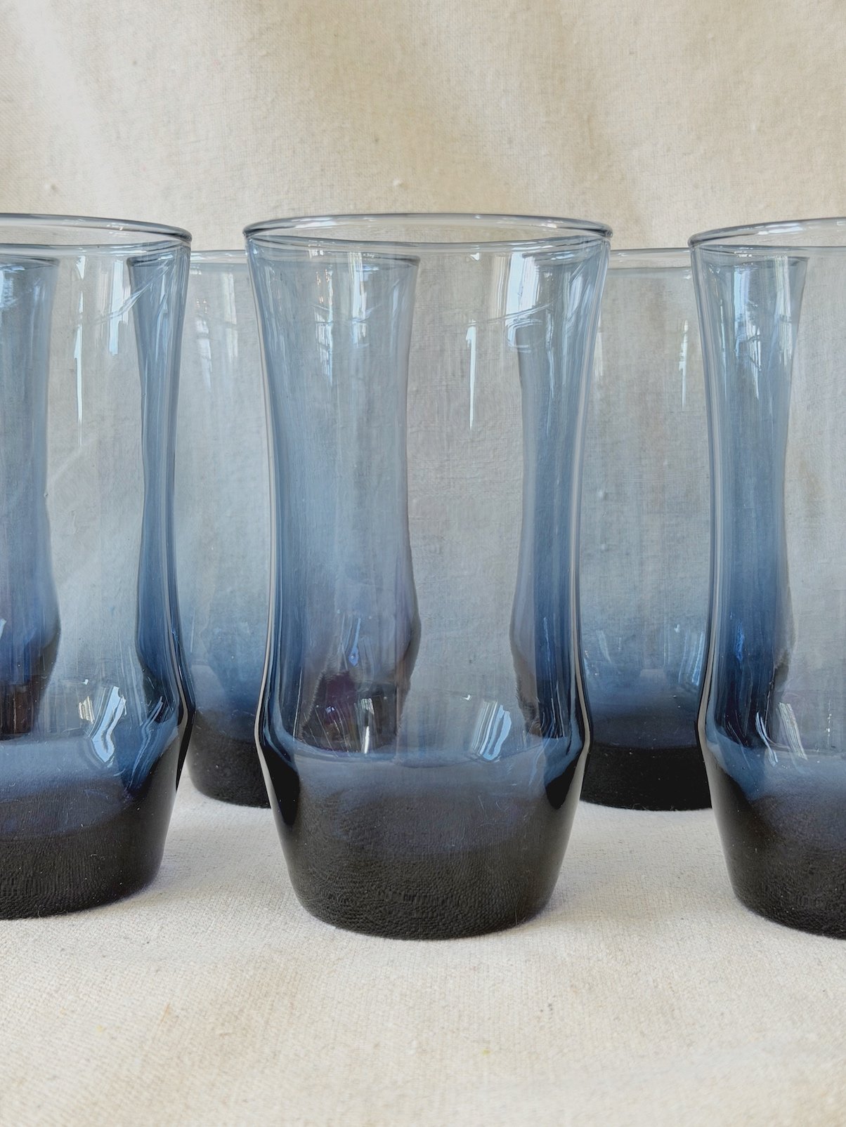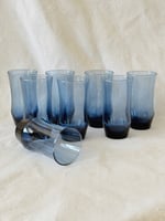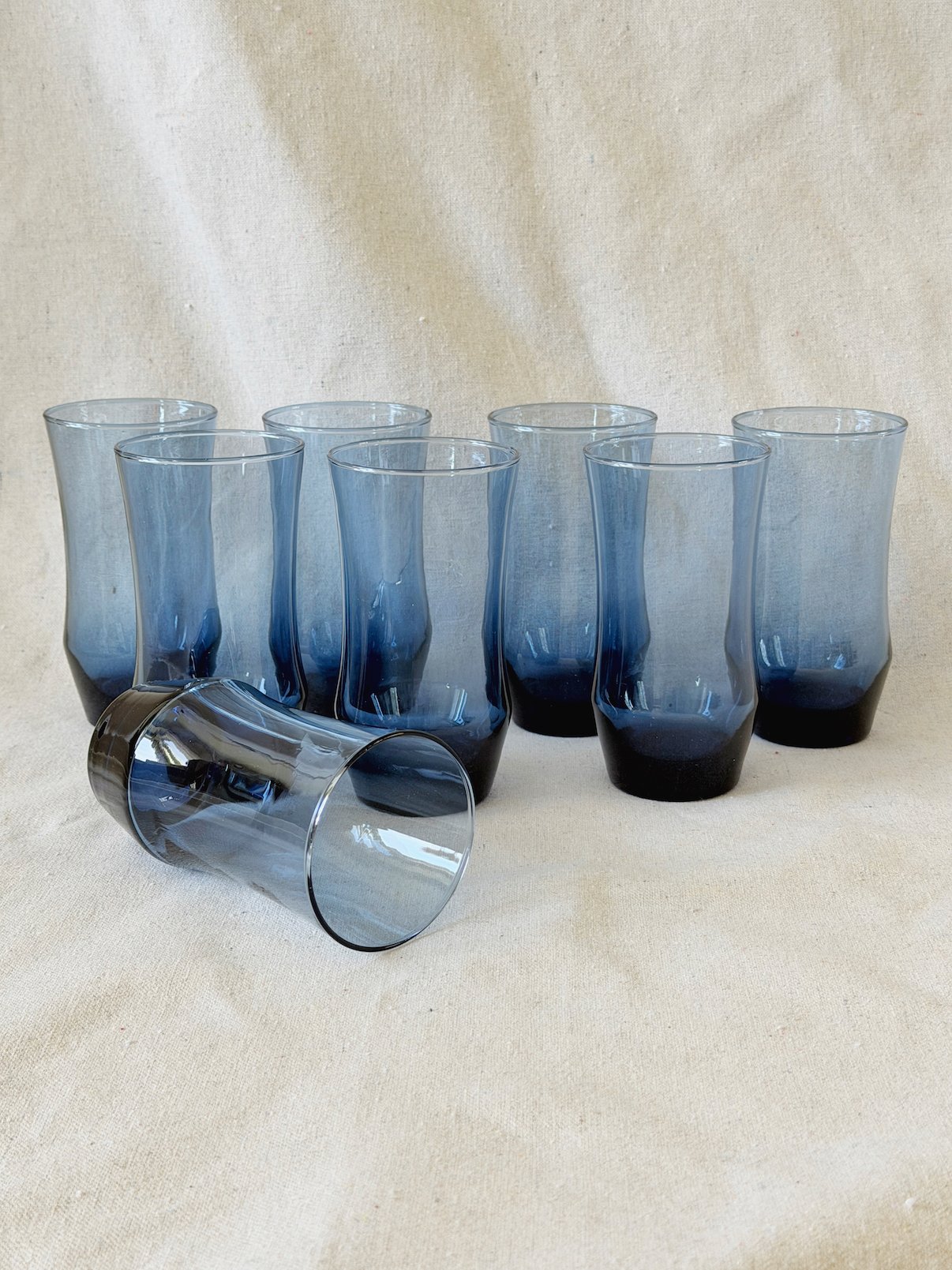 A set of 8 vintage 1970s Libbey Apollo Blue tumbler glasses in that dreamy smoky blue tone. With their classic mid-century shape and rich color, they bring instant retro charm to your table...perfect for everyday use or styled on open shelving.