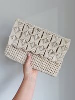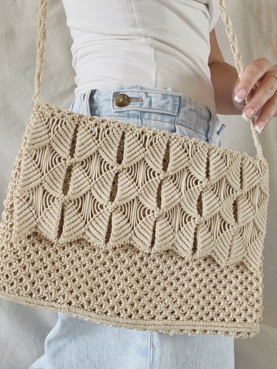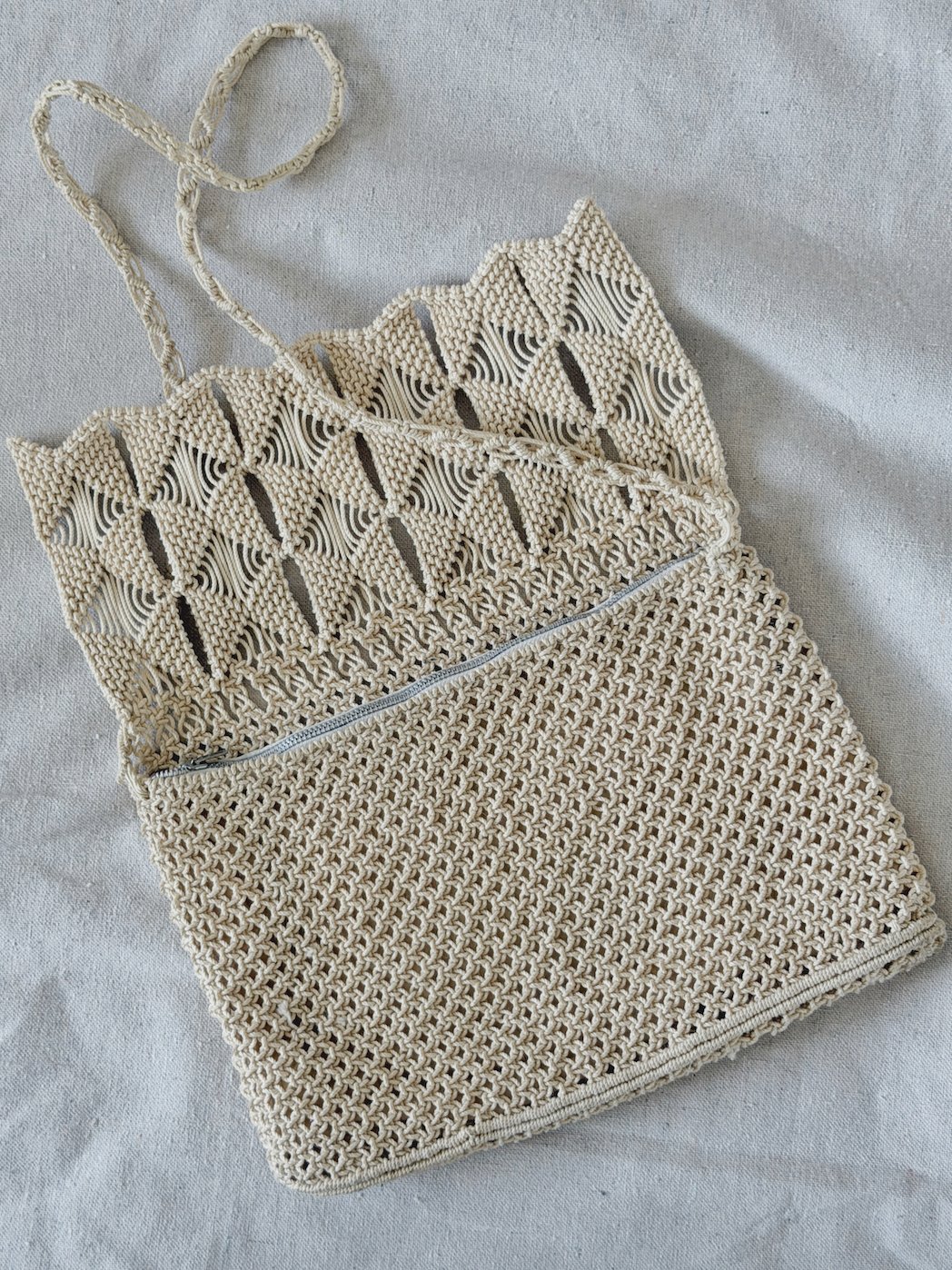 A vintage woven crossbody bag with a delicate crochet-style pattern and zip closure, light and textured with that easy bohemian charm that feels perfect for slow days, market strolls, and summer wandering.