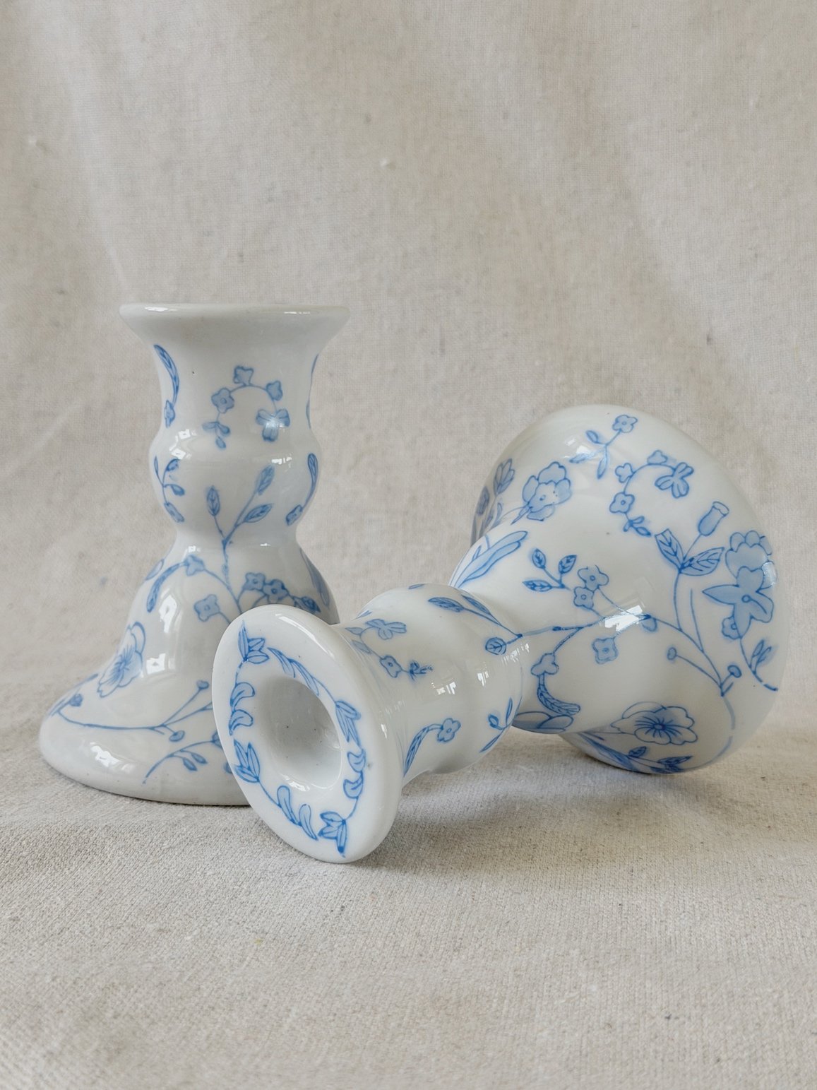 A pair of gorgeous vintage taper candle holders, most likely from the 1960s, featuring delicate hand-painted blue florals. Soft, romantic, and timeless—they add the sweetest touch of charm to any table or shelf.