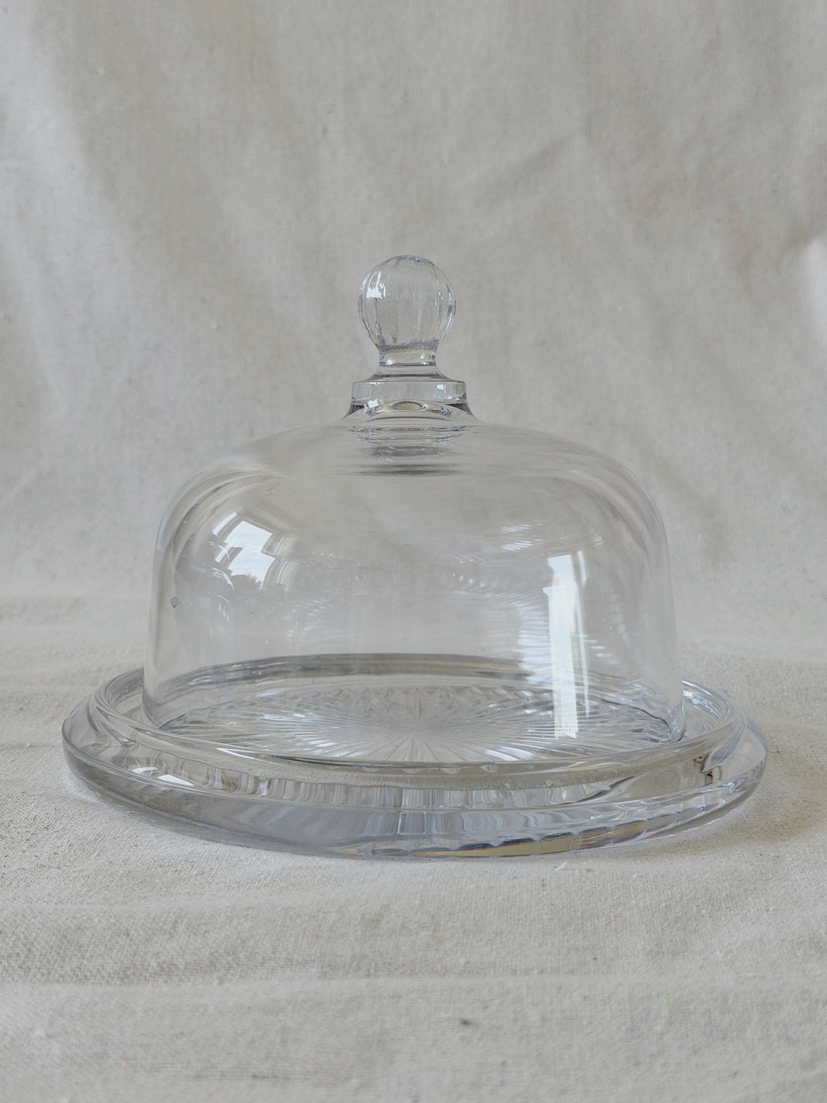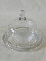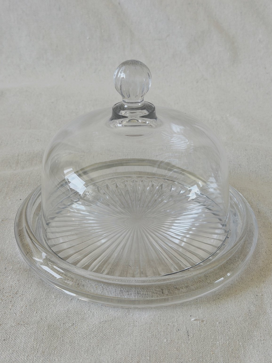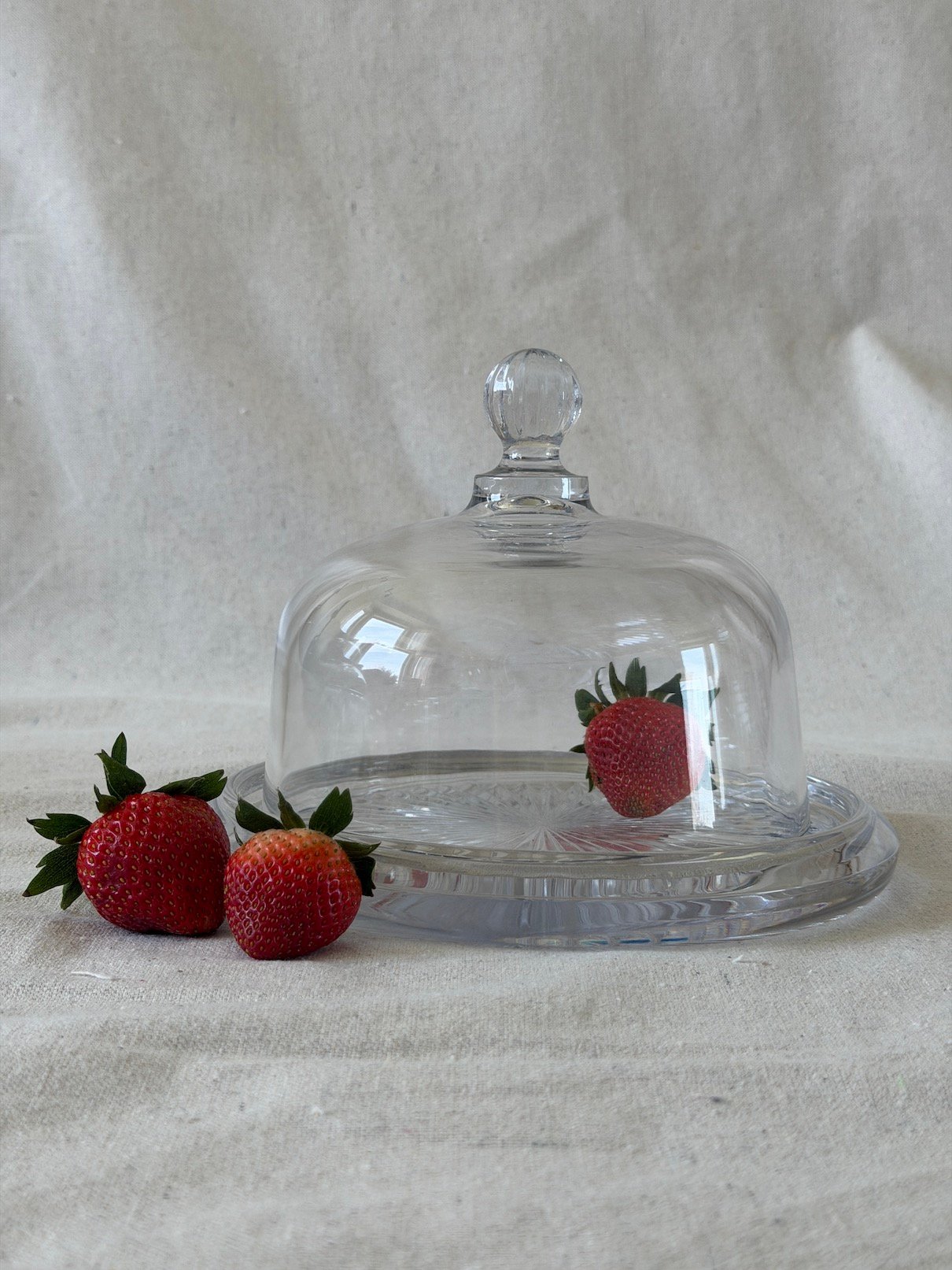 A vintage Mikasa Diamond Fire cheese dome, featuring a beautifully textured glass cloche and coordinating base that catches the light with a subtle, sparkling pattern. Elegant and timeless, it’s perfect for serving cheese, pastries, or styling as a standout tabletop accent.